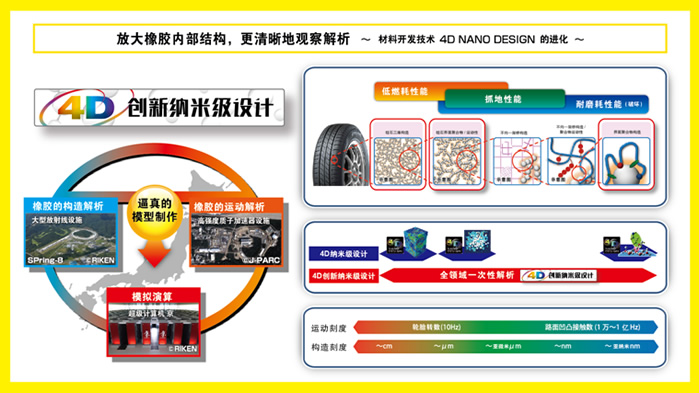 回顧鄧祿普的品牌發(fā)展歷程,技術創(chuàng)新是出現(xiàn)頻率最高的關鍵詞。鄧祿普技術團隊持續(xù)探索尖端科技,最新開發(fā)“4D創(chuàng)新納米級設計”技術運用大型放射光設備“Spring-8”、高強度質子加速器“J-PARC”和超級計算機“京”,從納米級微觀領域真實再現(xiàn)橡膠分子結構及運動形態(tài),使原材料的開發(fā)精度和效率實現(xiàn)了質的飛躍,全面提升了輪胎產品的低油耗性能、抓地力性能和耐磨耗性能。